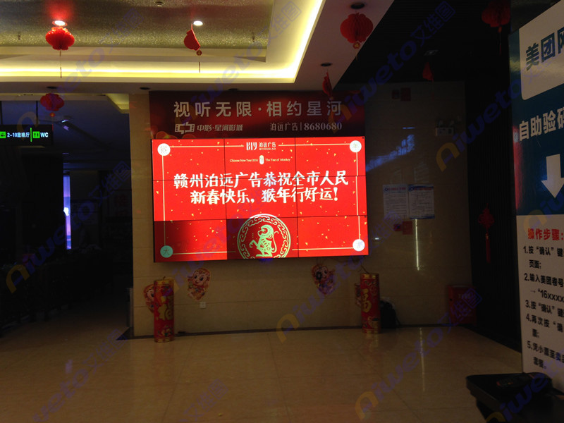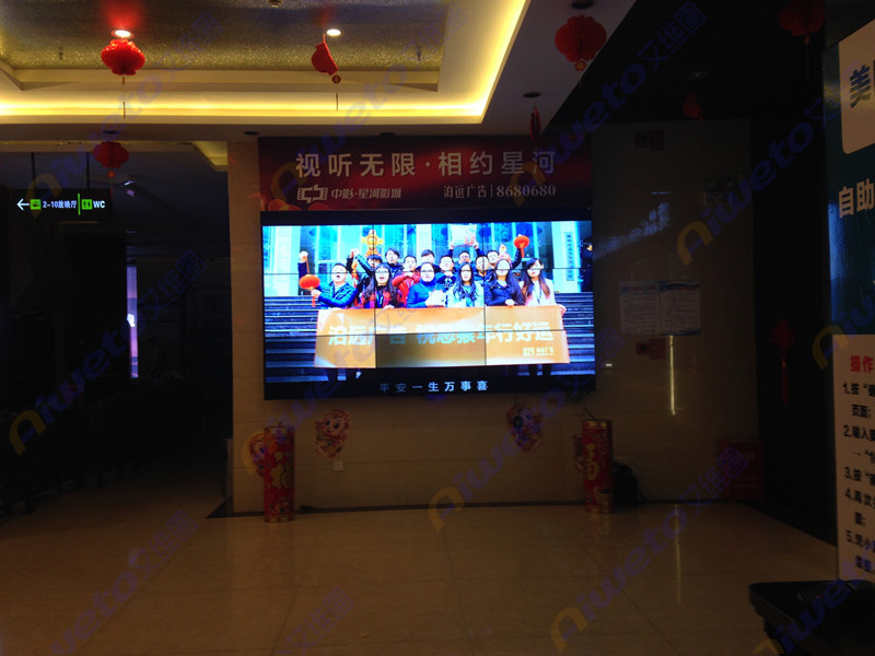 此次項目是為贛州星際國際影城大廳內安裝全高清、無線大屏幕液晶拼接系統(tǒng),為其打造了一整套集傳媒、廣告于一體的現(xiàn)代化影城。