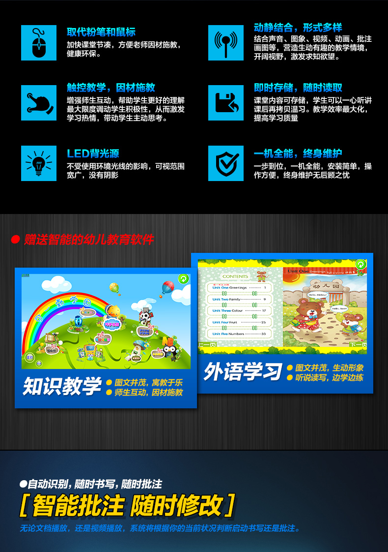 AW系列-多媒體教學(xué)一體機(jī),高清大屏顯示,壁掛支架多種使用方式,人性化機(jī)型設(shè)計(jì),立式與掛式兩種使用方法可交替使用,避免使用環(huán)境發(fā)生變化時(shí)產(chǎn)生的資源浪費(fèi)問(wèn)題采用LED背光源長(zhǎng)壽命,低功耗,環(huán)保節(jié)能。智能電子白板,各種文件一鍵加載,多點(diǎn)觸控智能電子白板適用于各種商務(wù)會(huì)議,支持手寫批注,兼容日常office辦公軟件,本地、U盤、網(wǎng)盤、局域網(wǎng)數(shù)據(jù)輕松駕馭。書寫流暢,減少視覺(jué)誤差,高端企業(yè)必備,多重主題背景,筆形色彩,任意選擇。高端配置 讓運(yùn)行速度,完美兼容WIN7,WIN8 隨意切換。